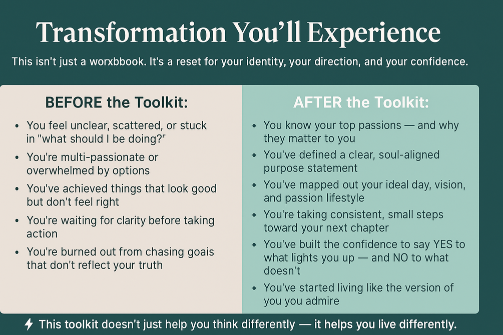 This all-in-one printable toolkit includes over 50+ guided tools designed to help you uncover your passions, define your purpose, and design a life that reflects your truth — step by step.